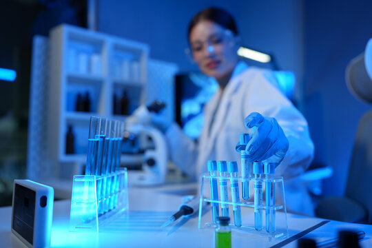 Female scientist examining a glowing blue liquid in a test tube. Professional researcher working in a modern laboratory on a medical discovery. Biotechnology and innovation concept