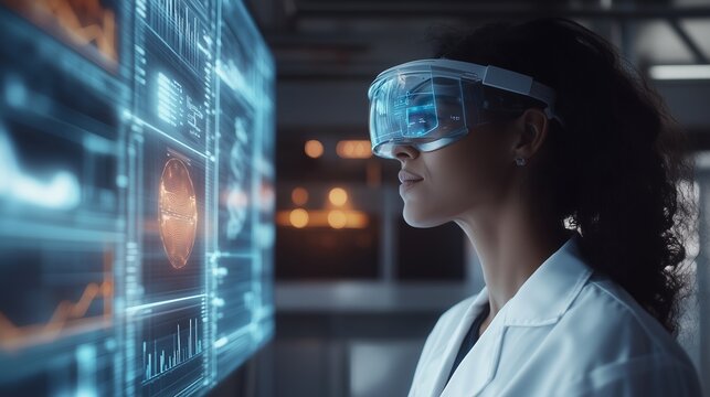 Scientist observing data through augmented reality interface, futuristic technology visualization. AI generated