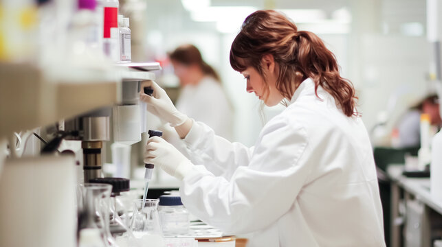 Scientist in a lab coat conducting an experiment, using a pipette to transfer liquid to a test tube, in a well-equipped laboratory with colleagues working in the background.