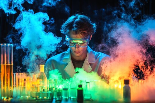 Creative young scientist conducting laboratory experiment with enthusiasm