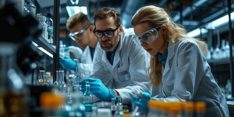 A team of scientists conducting chemistry experiments in a laboratory using advanced equipment and technology.
