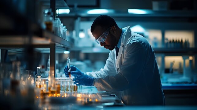 Scientists conducting research in a biotechnology lab, using pipettes and test tubes for medical and chemical experiments. Innovation in chemistry, healthcare, and medicine.