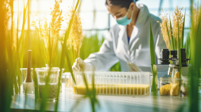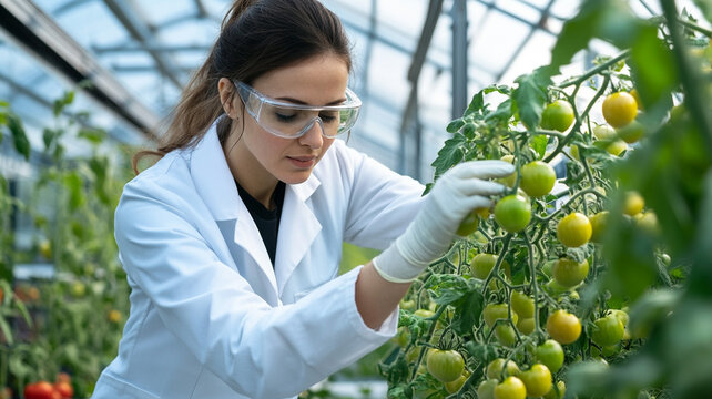 Generative AI : Female scientist examining a plants in greenhouse farm.