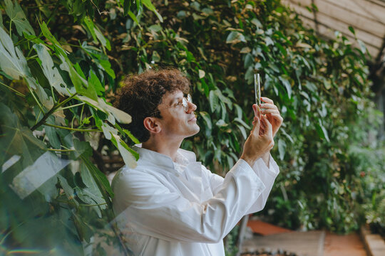 selective focus of smiling handsome scientist in white coat and goggles taking plant sample in flask in orangery