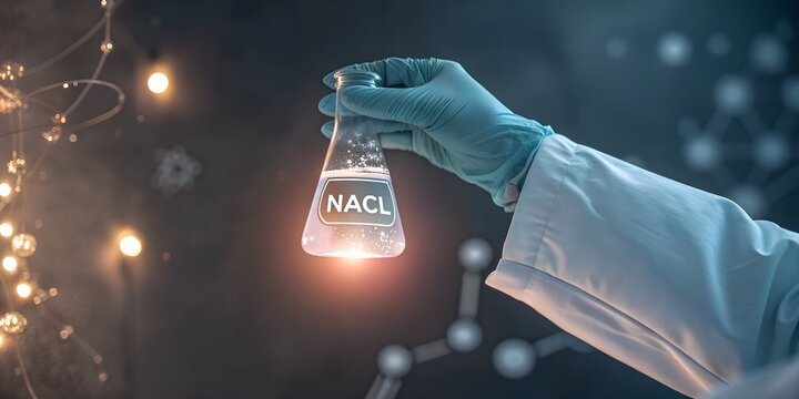 Gloved hand holding a glowing vial labeled "NaCl", dark science background, cinematic lighting
