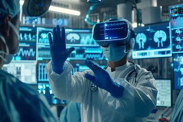 A scientist wearing VR headset is working a laboratory