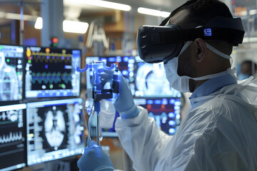 A scientist wearing VR headset is working a laboratory