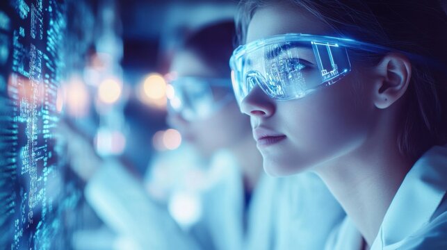 Lab technician analyzing sample with futuristic data overlays
