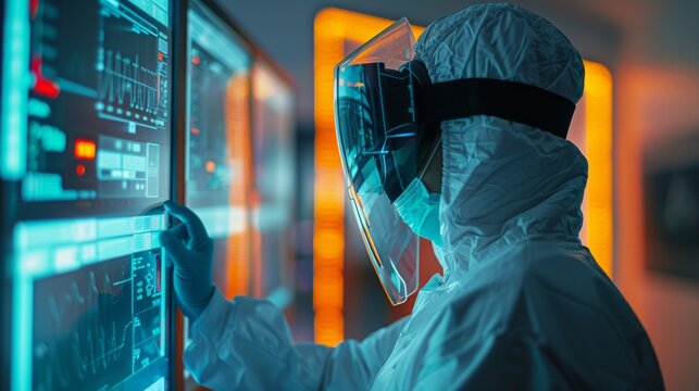 Scientist in protective gear analyzing data on high-tech screens in a futuristic laboratory