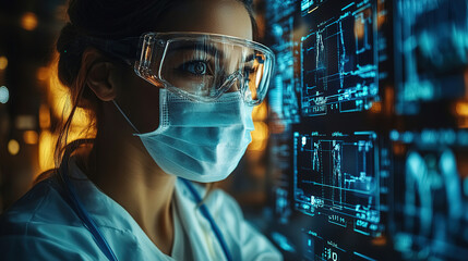 AI generated futuristic scene of a medical scientist in protective gear interacting with a holographic interface displaying heartbeat waveform DNA and medical icons