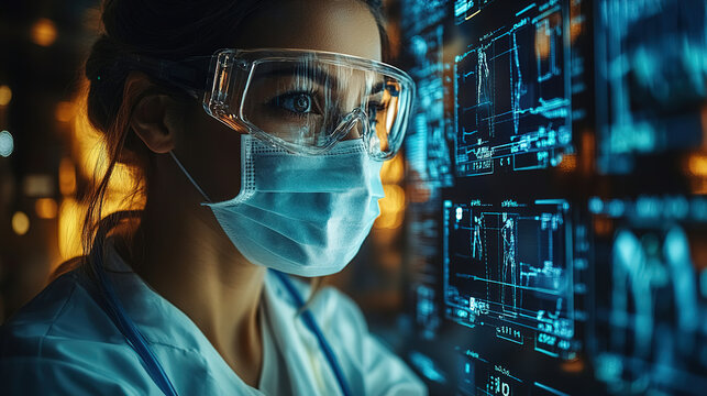 Healthcare professional analyzes data on a digital screen in a modern medical facility during nighttime hours. Generative AI