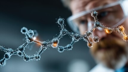 A close-up of a scientist observing a molecular structure, highlighting research and innovation in chemistry and science.