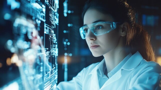 Future of Genomic Research: Scientist Interacting with Holographic DNA Visualizations and Advanced Data Interfaces in a High-Tech Laboratory