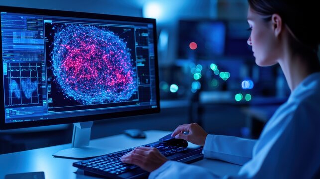 A scientist in a lab coat interacts with a futuristic digital interface displaying a glowing holographic brain in a high-tech research environment.
