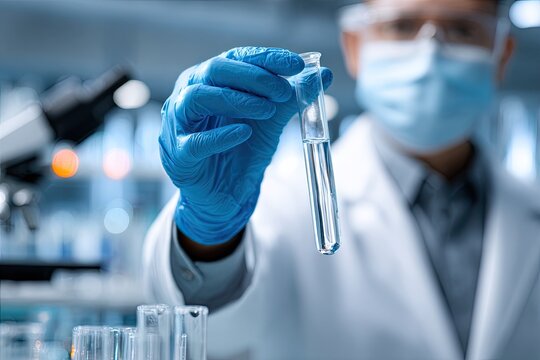 Scientists collaborating in laboratory conducting experiments with test tubes