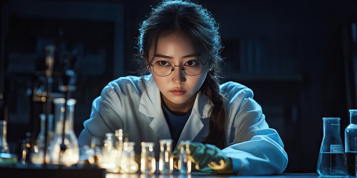 Asian female scientist in lab coat, carefully examining test tubes and beakers on a laboratory bench