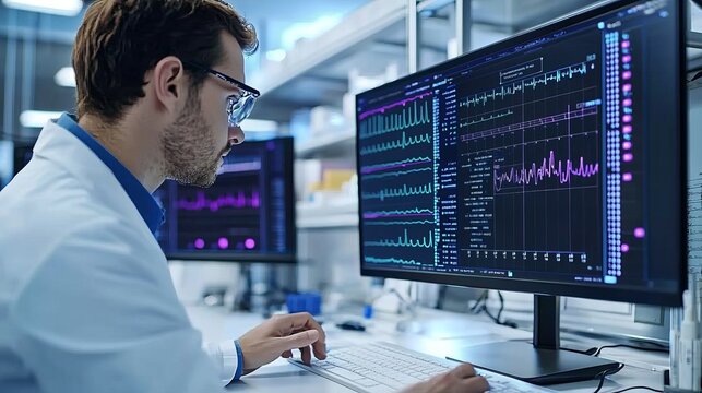 Scientist analyzing data on laboratory equipment