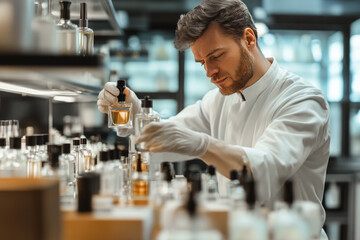 Fragrance scientist conducting perfume research in modern laboratory setting