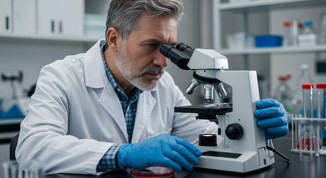 a man in a lab coat is looking through a microscope in a laboratory