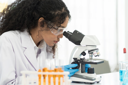 Woman scientist looking through microscope doing analysis for germs and bacteria of test sample in the laboratory. Female specialist working with biotechnology research with microscope