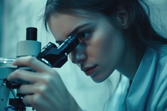 A young female scientist intently observes a specimen through a microscope, engrossed in scientific research.