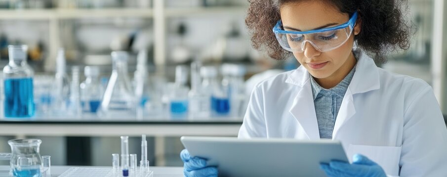 In a modern lab, a researcher in protective gear uses advanced technology for precise data analysis, conducting scientific experiments in a sterile environment with cuttingedge equipment