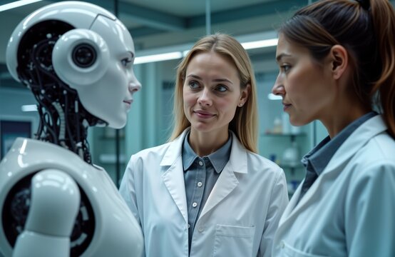 Two women scientists interact with humanoid robot in high-tech lab. Wearing lab coats, seem to analyzing robots features studying actions. Lab modern equipment, environment looks futuristic. Robots
