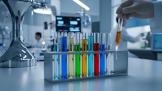 Scientist in protective gloves conducting chemical analysis with colorful test tubes in modern laboratory setting for research and development.