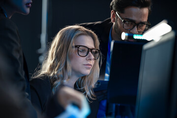 AI squad deep focus late night Diverse engineers train complex machine learning model analyze intricate datasets code screens glow bright innovation lab future tech build mode on.