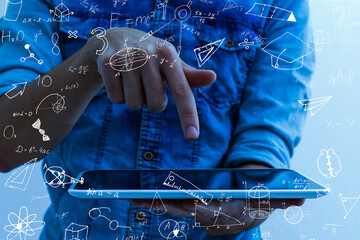 Double exposure of abstract virtual chemistry hologram on modern interior background, research and development concept.