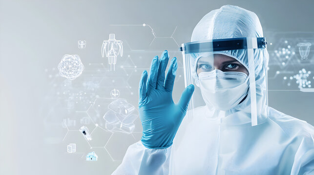 Medical professional in protective suit interacting with futuristic medical concepts and digital interface elements on grey background