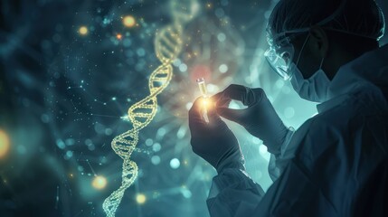 Scientist analyzing vial with dna strand overlay in a lab setting