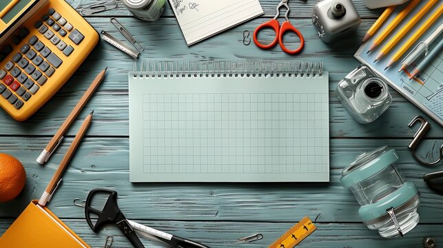 school supplies background with pencils and rulers, a scissors icon on a notebook, a school supplies concept banner design
