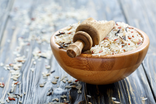 Yellow rice and spices on dark background