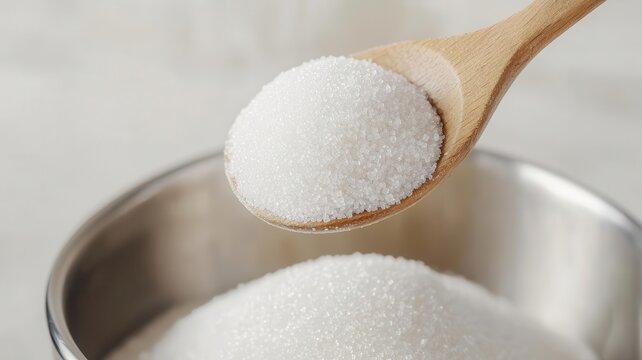 A heap of raw cane sugar being scooped with a wooden spoon into a mixing bowl   raw cane sugar, baking ingredient