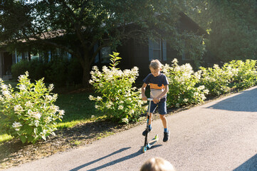Close-up of a young boy on a scooter. He is going to jump on the ramp and do tricks.
