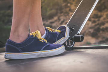 Close up view of teen's feet on a scooter ready to start a ride over the half pipe. Skater starting jumps and tricks at the skate park. Let's go enjoying. Youth, future brave, danger, risk concept