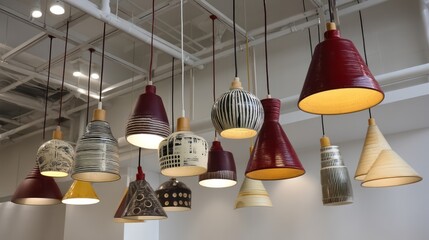 A contemporary collection of pendant lights in various shapes like cones and spheres, with metal shades featuring patterns such as stripes and dots