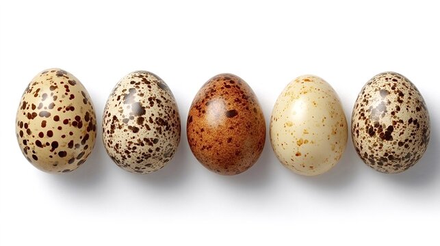 Five different bird eggs showcasing a range of unique speckled patterns and earthy colors, arranged horizontally on a clean white background, representing new life and nature's variety