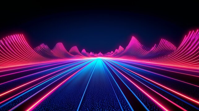 Long, blue and red strip of lights that are on a road. The lights are in a pattern that looks like a mountain range