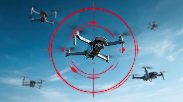 Drones are engaged in aerial maneuvers, captured through a targeting scope overlay. The drone flying in formation against a clear blue sky
