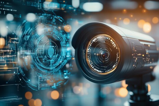 A surveillance camera juxtaposed with digital holograms shows the merging of security technology and futuristic digital capabilities.