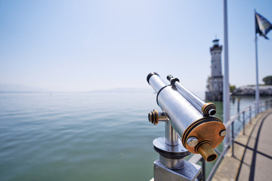Coin Operated Spyglass viewer next to the lakeside promenade looking out to the bay on Lindau's harbor.