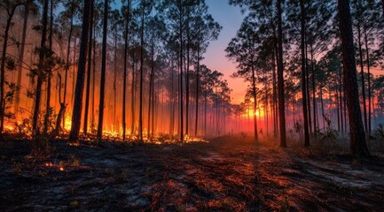 Forest fire at sunset.  Flames engulf the undergrowth, silhouettes of trees, vibrant colors