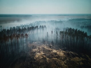 A dense, lush forest transformed into charred, blackened earth after a fire, aerial view with hazy atmosphere and deep depth of field showing the devastating impact of wildfire on nature.