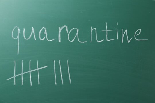 Counting days by drawing sticks with chalk and word Quarantine on chalkboard, closeup
