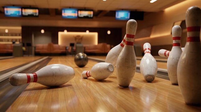 Bowling ball hitting pins on wooden lane in modern bowling alley,perfect strike in action with blurred scoreboard and seating in background