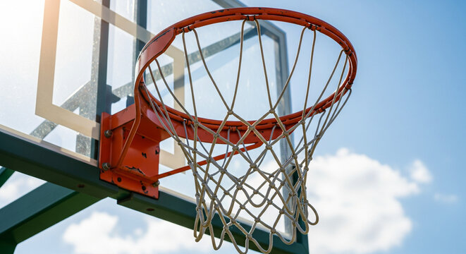 Vibrant basketball hoop under a clear blue sky, capturing the essence of outdoor sports and competitive play