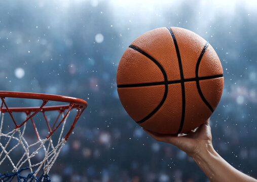 Winning points scored during an intense basketball game in a packed arena with fans cheering in excitement