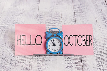 Writing note showing Hello October. Business concept for Last Quarter Tenth Month 30days Season Greeting Mini blue alarm clock standing above buffer wire between two paper